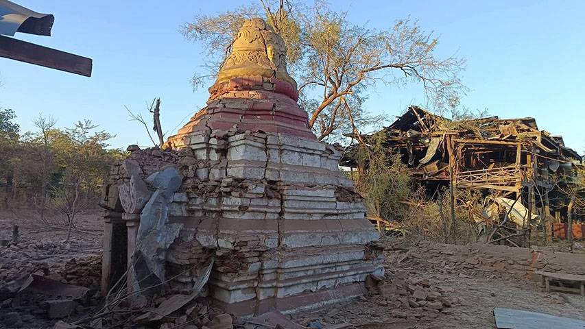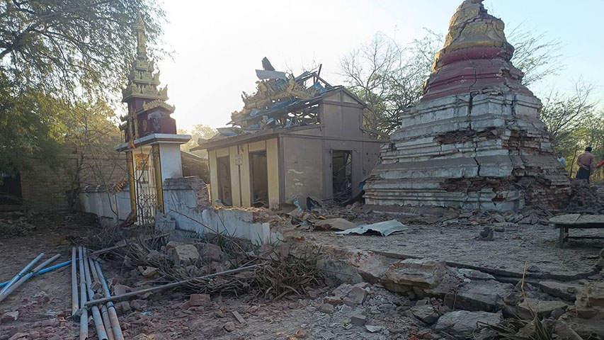 မကွေးတိုင်း၊ မြိုင်မြို့နယ်ထဲက ဘုန်းကြီးကျောင်းကို စစ်ကောင်စီတပ်က ဖေဖော်ဝါရီ ၉ ရက် ညပိုင်းမှာ ဂျက်တိုက်လေယာဉ်နဲ့ ဗုံးကြဲချခဲ့တာကြောင့် ဘုန်းကြီးကျောင်းဆောင်တွေ ပျက်စီးသွားခဲ့တယ်လို့ ဒေသခံတွေဆီကနေ သိရပါတယ်။