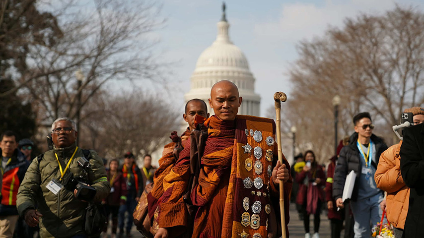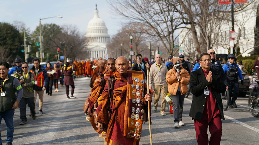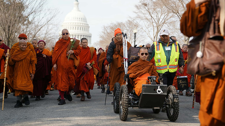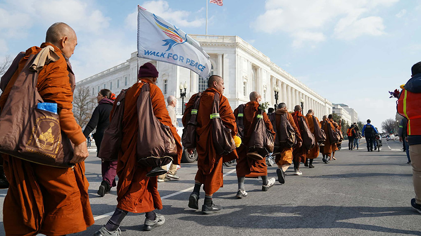 ကမ္ဘာ့ငြိမ်းချမ်းရေးအတွက် ခရီးရှည်လမ်းလျှောက်နေတဲ့ Walk for Peace ဆရာတော်တွေဟာ ဒေသစံတော်ချိန် ဖေဖော်ဝါရီ ၉ ရက်မှာ အမေရိကန်ပြည်ထောင်စု၊ မြို့တော် ဝါရှင်တန်ဒီစီကို ရောက်ရှိလာပြီးနောက် လွှတ်တော်နဲ့ လွတ်လပ်ရေးကျောက်တိုင်အနီး လင်ကွန်းအထိမ်းအမှတ်နေရာကို လမ်းလျှောက်ချီတက်ခဲ့ပြီး လူထုနဲ့ တွေ့ဆုံခဲ့ပါတယ်။
