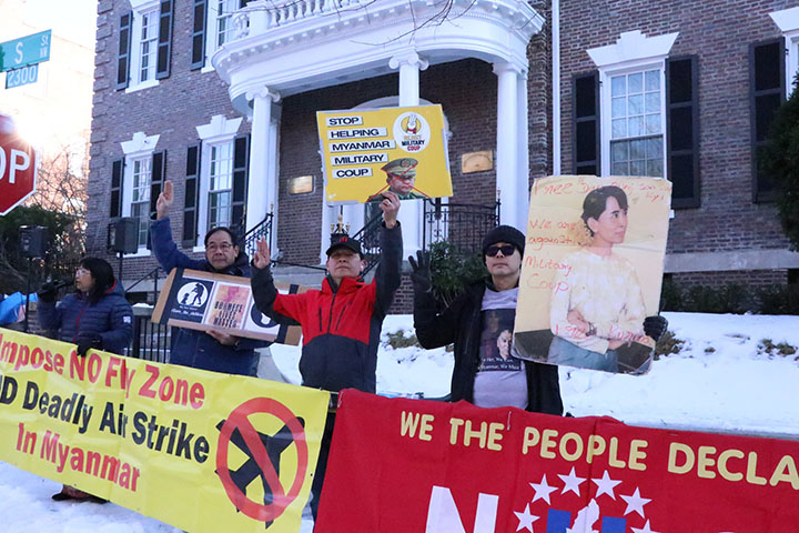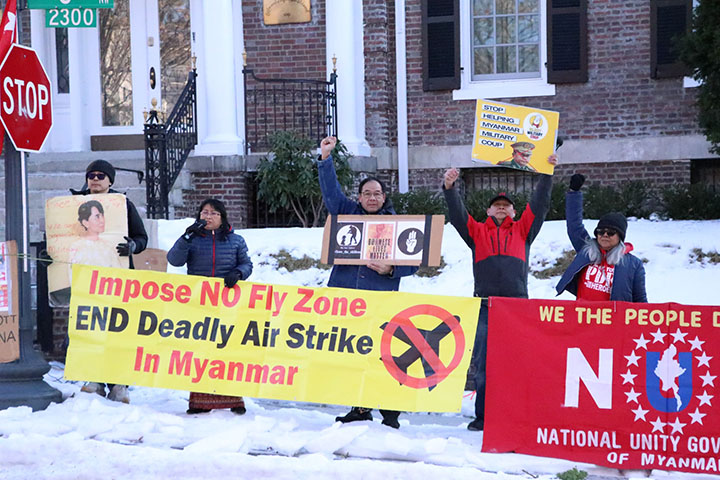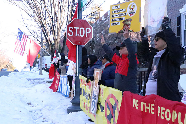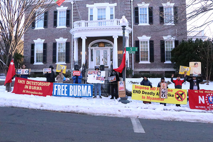 နွေဦးတော်လှန်ရေး ၅ နှစ်ပြည့် တော်လှန်ပုန်ကန်ဆဲသက်သေအဖြစ် အမေရိကန်နိုင်ငံ ဝါရှင်တန်ဒီစီ မြန်မာသံရုံးရှ့မှာ မြန်မာ့အရေးဆောင်ရွက်သူတွေက ဒေသစံတော်ချိန် ဖေဖော်ဝါရီ ၁၃ ရက်နေ့မွန်းလွဲပိုင်းက ဆန္ဒပြခဲ့ကြပါတယ်။