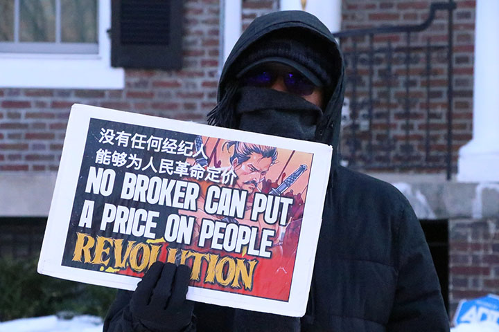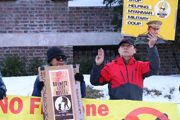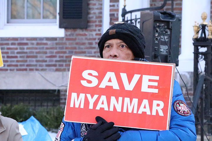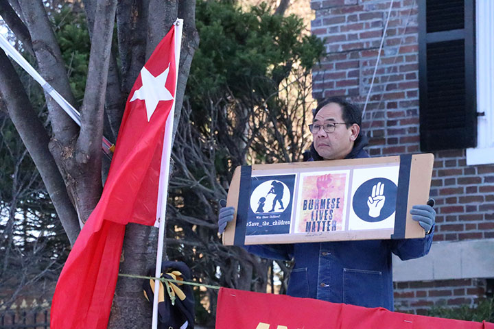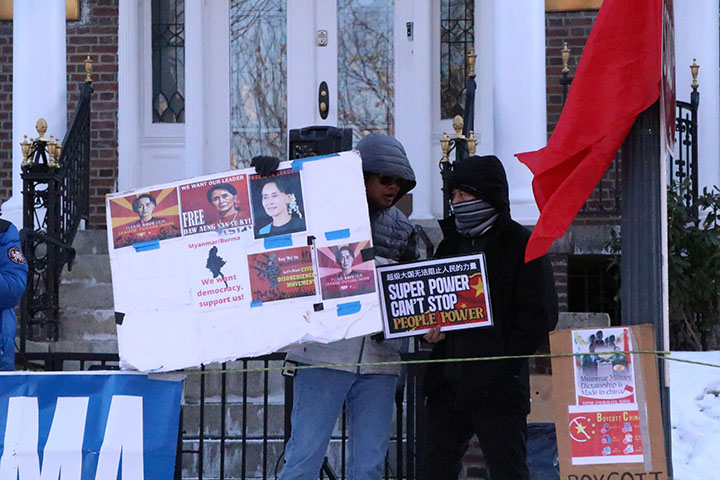 မြန်မာ့အရေးတက်ကြွလှုပ်ရှားသူ ဒေါက်တာထွန်းဝေ က “တော်လှန်ဆဲ ပုန်ကန်ဆဲဆိုတာ ကျနော်တို့ လာရောက်ပြီးတော့ ဆန္ဒထုတ်ဖော်တယ်၊ ပြီးတော့ သံရုံး နဲ့ မျက်နှာချင်းဆိုင်မှာရှိတဲ့ တရုတ်သံအမတ်ကိုလည်း ကျနော်တို့ မြန်မာပြည်တွင်းရေးကို ဝင်ရောက်စွက်ဖက်ပြီး လူသတ် အကြမ်းဖက်စစ်ကောင်စီကို မထောက်ခံဖို့ ကျနော်တို့ လာရောက်တောင်းဆိုတယ်ပေါ့။ ဒီနေ့လာတဲ့ရည်ရွယ်ချက်က အမှန်က ဖေဖော်ဝါရီ ၁ ရက်နေ့ကို လာချင်ပါတယ်။ ဒါပေမဲ့ အမေရိကန်မှာ ရာသီဥတုက အရမ်းဆိုးရွားတဲ့အတွက်၊ အခုအချိန်မှာလည်း ရာသီဥတုက အနုတ်ဒီဂရီဖြစ်နေပါတယ်၊ ဒါကို ကျနော်တို့တော်လှန် ညီအကိုမောင်နှမတွေ လာရောက်ပြီးတော့ ဆန္ဒထုတ်ဖော်တာဖြစ်ပါတယ်” လို့ ပြောပါတယ်။
