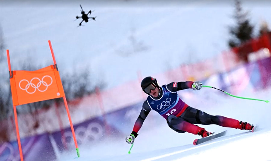 FPV (First Person View) ဒရုန်းတွေကို နှင်းလျှောကစားသမားတွေကို တောင်စောင်းအောက်ဆီ တနာရီ ၁၂၀ ကီလိုမီတာမြန်နှုန်းနဲ့ လိုက်လံရိုက်ကူးတာ ဒါမှမဟုတ် လူးဂျ် (luge) နဲ့ စကယ်လီတန် (skeleton) ပြိုင်ပွဲတွေမှာ ရေခဲပြင်ချောင်းလမ်းကြောင်းအတွင်း လိုက်ပါရိုက်ကူးတာမျိုး မြင်တွေ့ရပါတယ်။