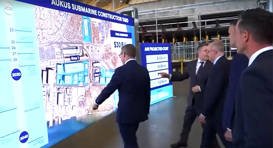 အမေရိကန်၊ ဩစတြေးလျနဲ့ ဗြိတိန်တို့ပါတဲ့ သုံးပွင့်ဆိုင် AUKUS ကာကွယ်ရေး သဘောတူညီချက်အရ နျူကလီးယားစွမ်းအင်သုံး ရေငုပ်သင်္ဘောတွေကို တည်ဆောက်ရာမှာ အထောက်အကူဖြစ်စေမဲ့ သင်္ဘောကျင်း တည်ဆောက်မှု တိုးတက်စေဖို့ ဩစတြေးလျဒေါ်လာ ၃ ဒသမ ၉ ဘီလီယံ (အမေရိကန် ဒေါ်လာ ၂ ဒသမ ၇၆ ဘီလီယံ) သုံးမယ်လို့ ဩစတြေးလျက ဖေဖော်ဝါရီ ၁၅ ရက်မှာ ပြောပါတယ်။