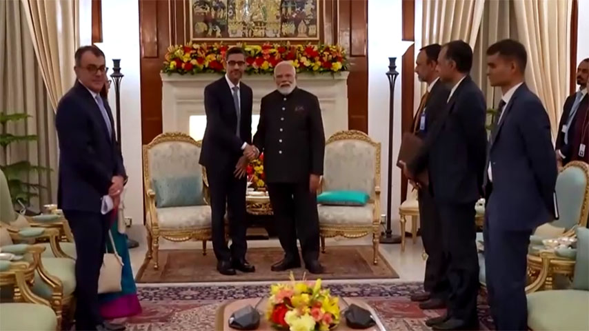 အိန္ဒိယဝန်ကြီးချုပ် နာရန်ဒြာမိုဒီနဲ့ Google ရဲ့ အမှုဆောင်အရာရှိချုပ် ဆွန်ဒါ ပီချိုင်းတို့ ဒေလီမှာကျင်းပတဲ့ ဉာဏ်ရည်တု AI ထိပ်သီးအစည်းအဝေးမှာ ဖေဖော်ဝါရီ ၁၈ ရက်က တွေ့ဆုံခဲ့ပါတယ်။