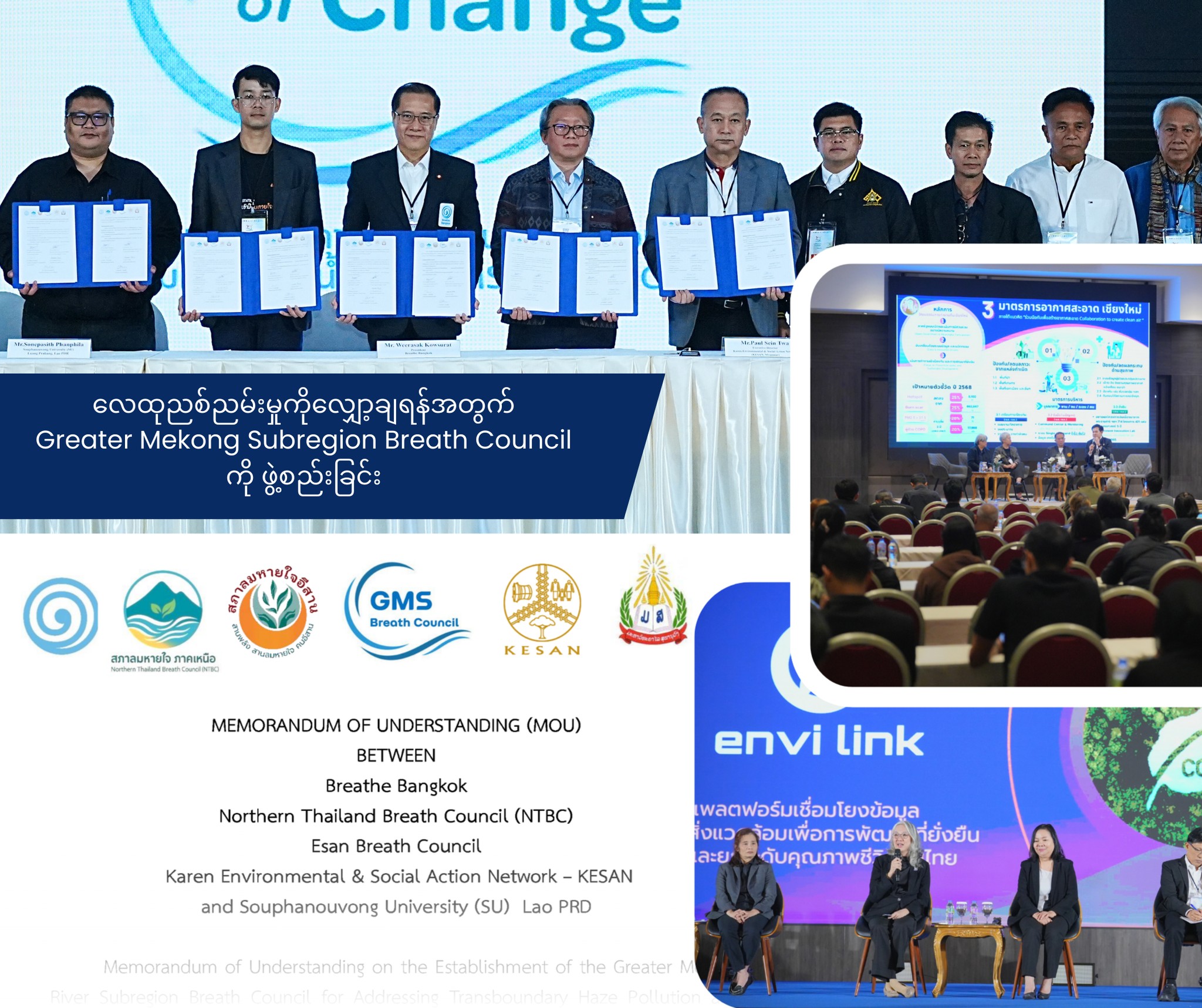 ထိုင်းနိုင်ငံ၊ လာအိုနိုင်ငံတို့က အရပ်ဘက်လူမှုအဖွဲ့အစည်းတွေနဲ့ ကရင်သဘာဝပတ်ဝန်းကျင်နှင့် လူမှုရေးဆိုင်ရာ လှုပ်ရှားမှုကွန်ရက်၊ သံလွင်ငြိမ်းချမ်းရေးဥယျာဉ်တို့အတူ Greater Mekong Subregion Breath Council (GMS Breath Council) ကို ဖွဲ့စည်းရေးနဲ့ ပတ်သက်ပြီး ဇန်နဝါရီ ၂၀ ရက်က သဘောတူညီမှုစာချွန်လွာ (MOU) ကို လက်မှတ်ရေးထိုးခဲ့ကြောင်း ကရင်သဘာဝပတ်ဝန်းကျင်နှင့် လူမှုရေးဆိုင်ရာ လှုပ်ရှားမှုကွန်ရက်က ထုတ်ပြန်ပါတယ်။