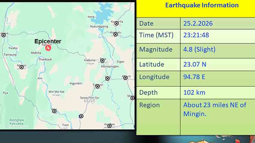 ည ၁၁ နာရီ ၂၁ မိနစ်ကျော်မှာ မင်းကင်းမြို့ရဲ့ အရှေ့မြောက်ဘက် ၂၃ မိုင်လောက်အကွာ၊ မြေအောက်အနက် ၁၀၂ ကီလိုမီတာကို ဗဟိုပြုပြီး လှုပ်ရှားသွားတာပါ။