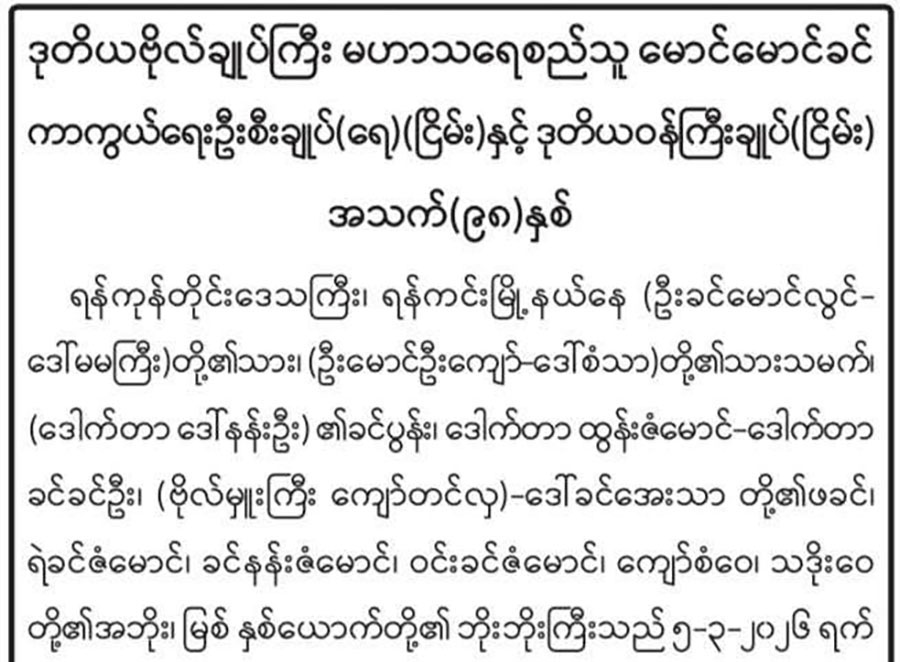 ကာကွယ်ရေးဦးစီးချုပ်(ရေ) ဒုတိယဗိုလ်ချုပ်ကြီးဟောင်း မောင်မောင်ခင် (အသက် ၉၈ နှစ်) ဟာ ရန်ကုန်မြို့၊ ရန်ကင်းမြို့နယ်က သူ့ရဲ့နေအိမ်မှာပဲ မနေ့ညနေမှာ ကွယ်လွန်သွားတာဖြစ်ပြီး သူ့ရဲ့ လုပ်အလောင်းကို မတ် ၇ ရက်မှာ တပ်မတော်စစ်ဆေးရုံ ခုတင် ၁၀၀၀ မင်္ဂလာဒုံ ငြိမ်းအေးဇရပ်မှ မင်္ဂလာဒုံစစ်သင်္ချိုင်းကို ပို့ဆောင်သင်္ဂြိုဟ်မယ်လို့ သိရပါတယ်။