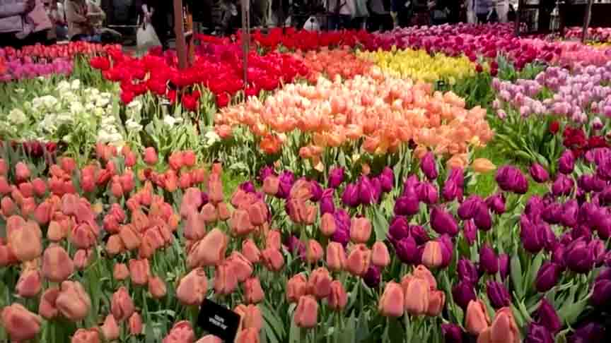 ပြပွဲကိုလာတဲ့ ဧည့်သည်တွေက ပန်းရောင် ကြွေပန်းပင်တွေ၊ နူးညံ့သိမ်မွေ့တဲ့ အဖြူရောင်သစ်ခွပန်းတွေ၊ ခရမ်းရောင်၊ လိမ္မော်ရောင်နဲ့ အဝါရောင် ကျူးလစ်ပန်းခင်းတွေကို ဖြတ်သန်းသွားလာနေကြပါတယ်။