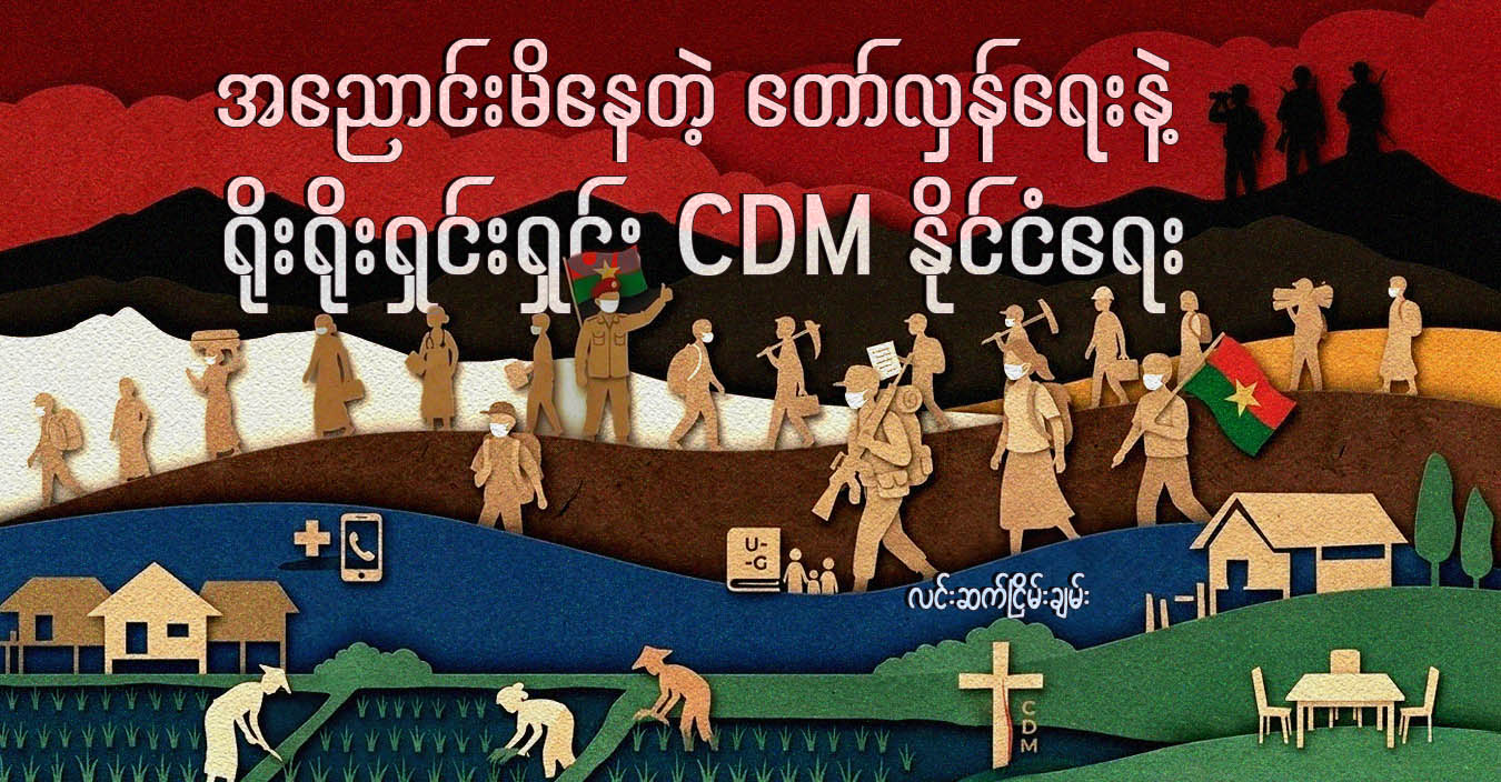 ပြောရရင် NUG အစိုးရလက်အောက်ခံအဖွဲ့တွေ ဖြစ်နေတာတောင် CDM တွေက CDM တွေရဲ့ သွေးကို ထုတ်ဖော်ပြသခဲ့ကြတယ်။ CDM သွေး ဆိုတာက မတရားမှုတွေကို တွန်းလှန် ဆန့်ကျင်မယ် ဆိုတဲ့စိတ်ဓာတ်။ အဲဒီလို စိတ်ဓာတ်ခွန်အားက သိပ်ကြီးမားခဲ့လေတော့ ကိုယ့်ထမင်းအိုးကိုယ် ပြတ်ပြတ်သားသား ရိုက်ခွဲခဲ့ကြတာမှ ဘဝမှာ နောက်ထပ်ဆုံးရှုံးစရာ အသက်နဲ့ခန္ဓာသာ ကျန်တော့တယ်လို့ ပြောရမဲ့အထိ။