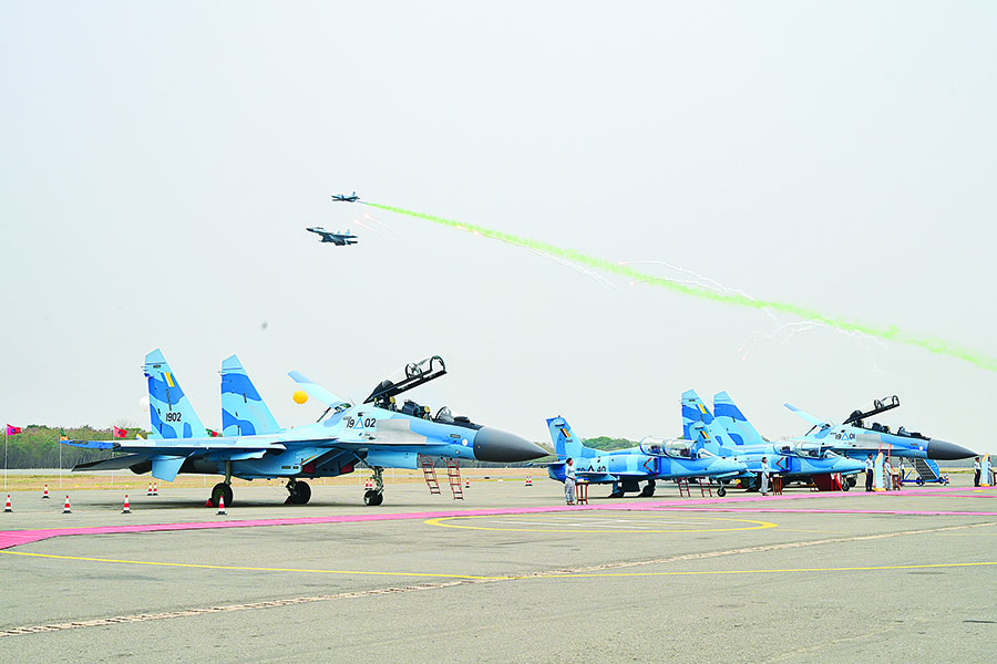 မနေ့က မိတ္ထီလာတပ်နယ် လေတပ်စခန်းဌာနချုပ်မှာ ပြုလုပ်တဲ့ တပ်တော်ဝင်ပွဲမှာ SU-30 ၅ စင်း၊ K-8W နဲ့ ချက်နိုင်ငံထုတ် L-410 လေယာဉ်တွေကို စစ်ခေါင်းဆောင် ထုတ်ပြခဲ့ပြီး စစ်ပွဲတွေကို ခုခံတွန်းလှန်နိုင်ဖို့ အသင့်ဖြစ်နေပြီလို့ စစ်ခေါင်းဆောင်က ပြောပါတယ်။